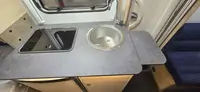 Volledige keuken met 85 L compressor-koelkast, 2-pits gasstel en rvs-spoelbak – perfect voor langere verblijven.